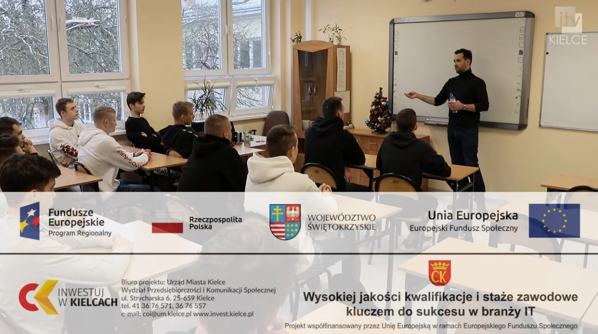 W filmie, oprócz relacji z wizyty w ramach cyklu "Bliżej Biznesu", znajdą Państwo także krótki zapis z odwiedzin pana Matejko w Zespole Szkół Informatycznych w Kielcach, gdzie w ramach projektu pn. "Wysokiej jakości kwalifikacje i staże zawodowe kluczem do sukcesu w branży IT" opowiadał o prowadzeniu biznesu w sektorze IT w Kielcach.